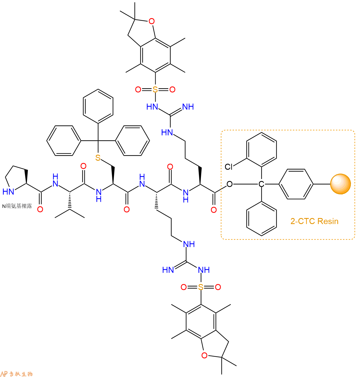 最后再经过步骤二得到 H2N-Pro-Val-Cys(Trt)-Arg(Pbf)-Arg(Pbf)-CTC Resin,结构如下: