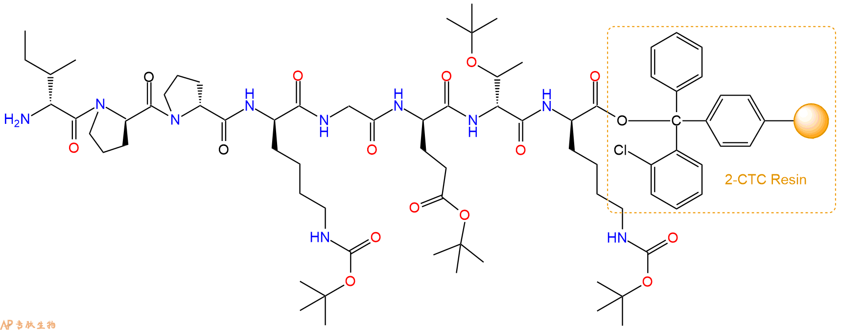 最后再经过步骤二得到 H2N-DIle-DPro-DPro-DLys(Boc)-Gly-DGlu(OtBu)-DThr(tBu)-DLys(Boc)-CTC Resin,结构如下: