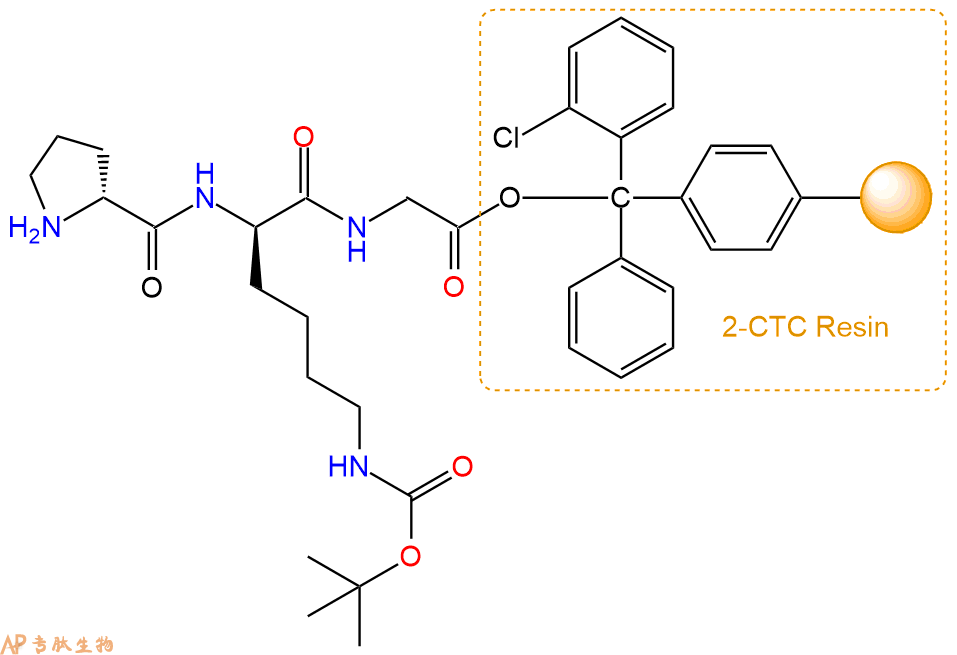 最后再经过步骤二得到 H2N-DPro-DLys(Boc)-Gly-CTC Resin,结构如下: