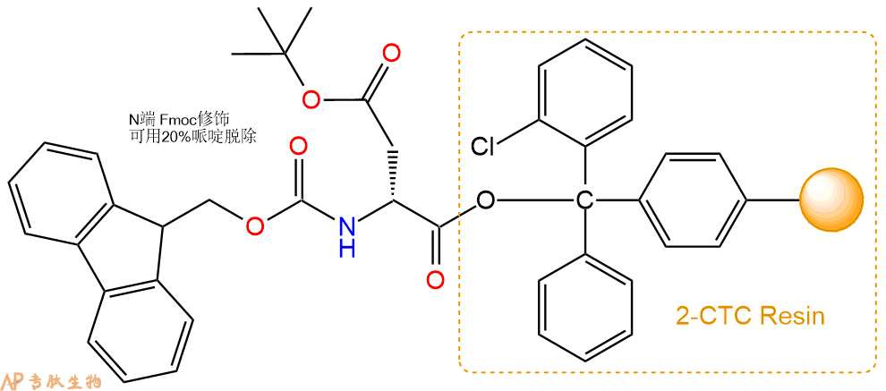 1、合成CTC树脂:称取0.25g CTC Resin(如初始取代度约为0.59mmol/g)和0.18mmol Fmoc-DAsp(OtBu)-OH于反应器中,加入适量DCM溶解氨基酸(需要注意,此时CTC树脂体积会增大好几倍,避免DCM溶液过少),再加入0.44mmol DIPEA(Mw:129.1,d:0.740g/ml),反应2-3小时后,可不抽滤溶液,直接加入1ml的HPLC级甲醇,封端半小时。依次用DMF洗涤2次,甲醇洗涤1次,DCM洗涤一次,甲醇洗涤一次,DCM洗涤一次,DMF洗涤2次(这里使用甲醇和DCM交替洗涤,是为了更好地去除其他溶质,有利于后续反应)。得到 Fmoc-DAsp(OtBu)-CTC Resin。结构图如下: