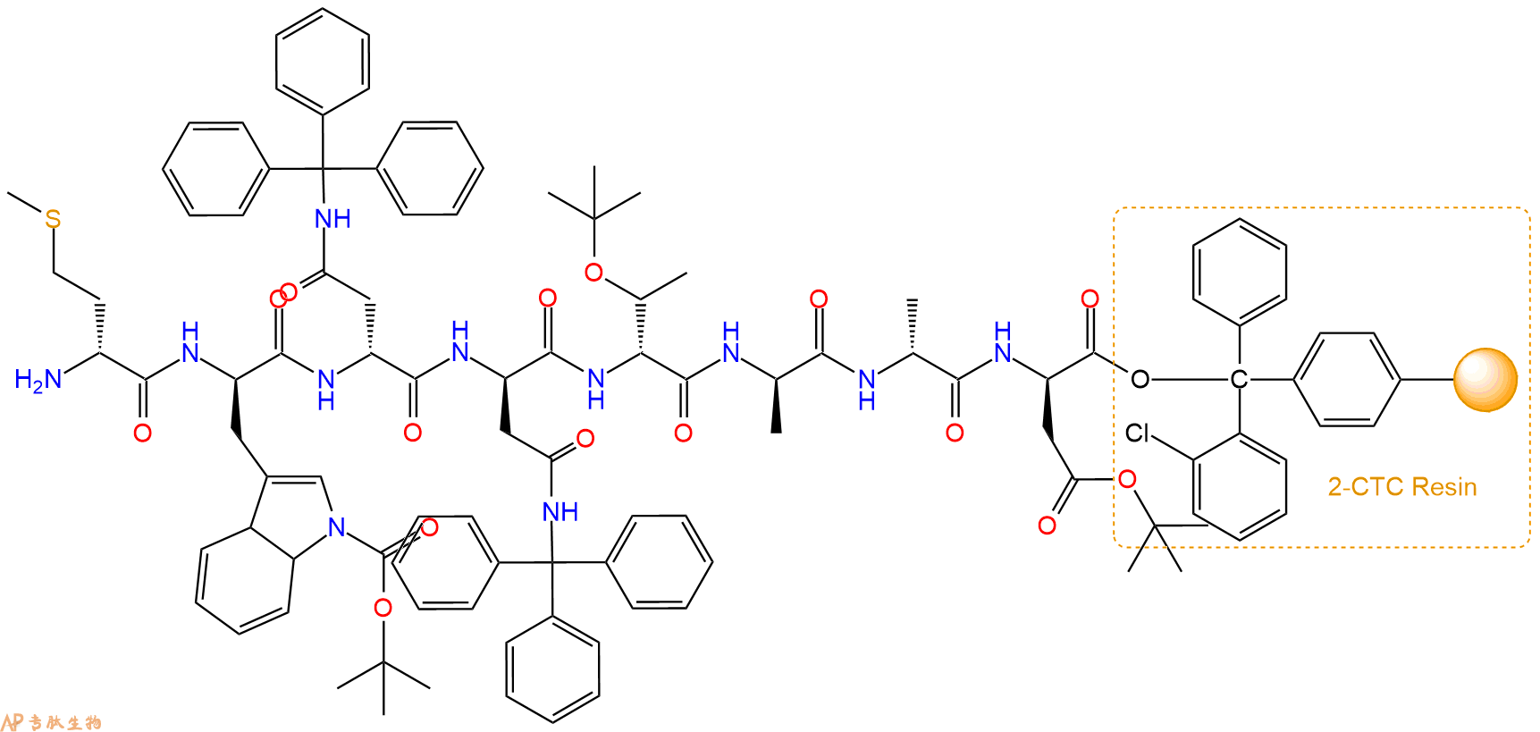 最后再经过步骤二得到 H2N-DMet-DTrp(Boc)-DAsn(Trt)-DAsn(Trt)-DThr(tBu)-DAla-DAla-DAsp(OtBu)-CTC Resin,结构如下:
