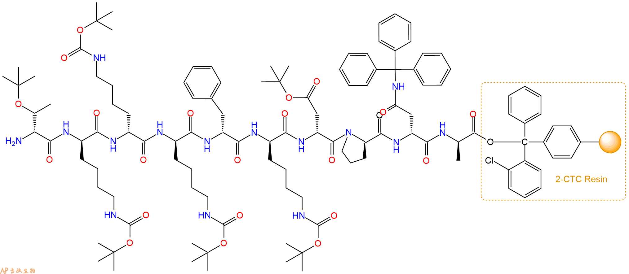 最后再经过步骤二得到 H2N-DThr(tBu)-DLys(Boc)-DLys(Boc)-DLys(Boc)-DPhe-DLys(Boc)-DAsp(OtBu)-DPro-DAsn(Trt)-DAla-CTC Resin,结构如下: