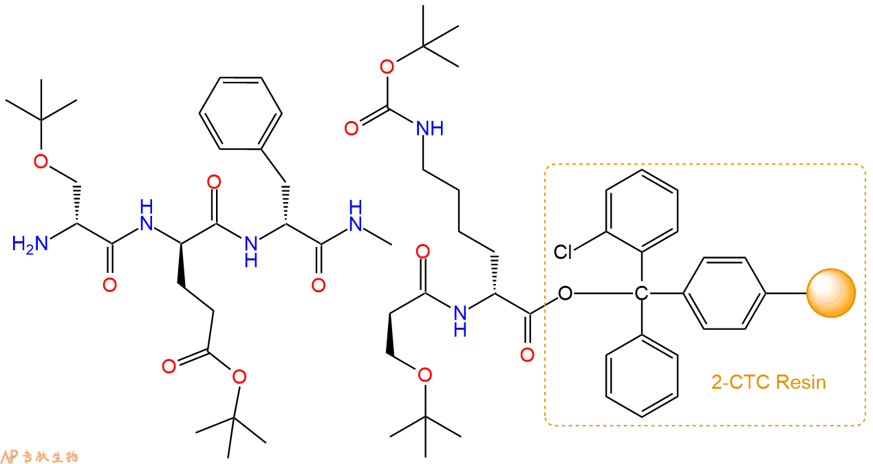 最后再经过步骤二得到 H2N-DSer(tBu)-DGlu(OtBu)-DPhe-DSer(tBu)-DLys(Boc)-CTC Resin,结构如下:
