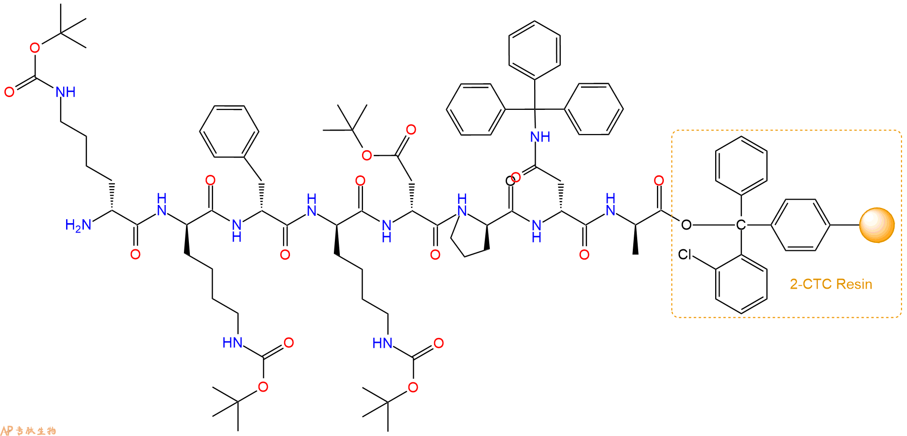 最后再经过步骤二得到 H2N-DLys(Boc)-DLys(Boc)-DPhe-DLys(Boc)-DAsp(OtBu)-DPro-DAsn(Trt)-DAla-CTC Resin,结构如下: