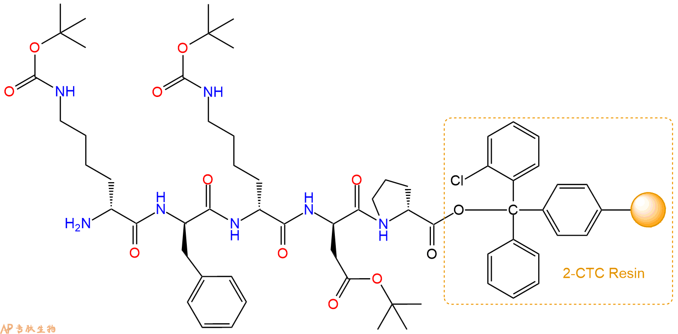 最后再经过步骤二得到 H2N-DLys(Boc)-DPhe-DLys(Boc)-DAsp(OtBu)-DPro-CTC Resin,结构如下:
