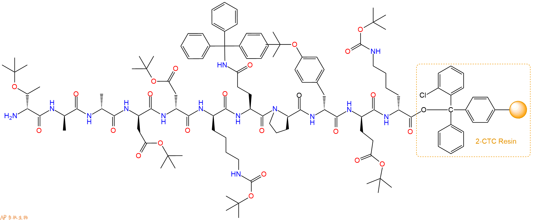 最后再经过步骤二得到 H2N-DThr(tBu)-DAla-DAla-DAsp(OtBu)-DAsp(OtBu)-DLys(Boc)-DGln(Trt)-DPro-DTyr(tBu)-DGlu(OtBu)-DLys(Boc)-CTC Resin,结构如下: