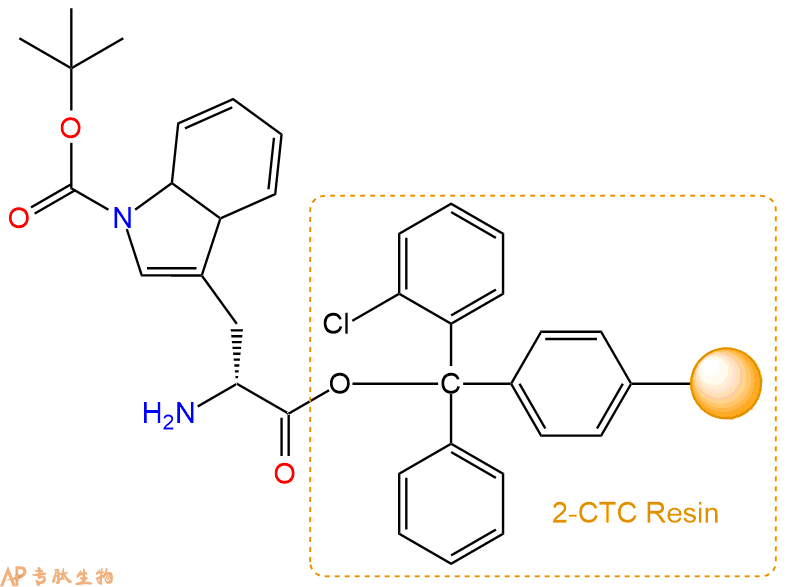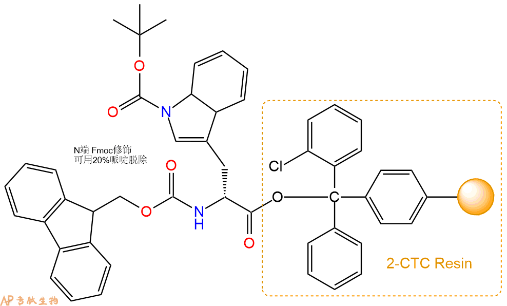 1、合成CTC树脂:称取0.77g CTC Resin(如初始取代度约为0.66mmol/g)和0.61mmol Fmoc-DTrp(Boc)-OH于反应器中,加入适量DCM溶解氨基酸(需要注意,此时CTC树脂体积会增大好几倍,避免DCM溶液过少),再加入1.52mmol DIPEA(Mw:129.1,d:0.740g/ml),反应2-3小时后,可不抽滤溶液,直接加入1ml的HPLC级甲醇,封端半小时。依次用DMF洗涤2次,甲醇洗涤1次,DCM洗涤一次,甲醇洗涤一次,DCM洗涤一次,DMF洗涤2次(这里使用甲醇和DCM交替洗涤,是为了更好地去除其他溶质,有利于后续反应)。得到 Fmoc-DTrp(Boc)-CTC Resin。结构图如下:
