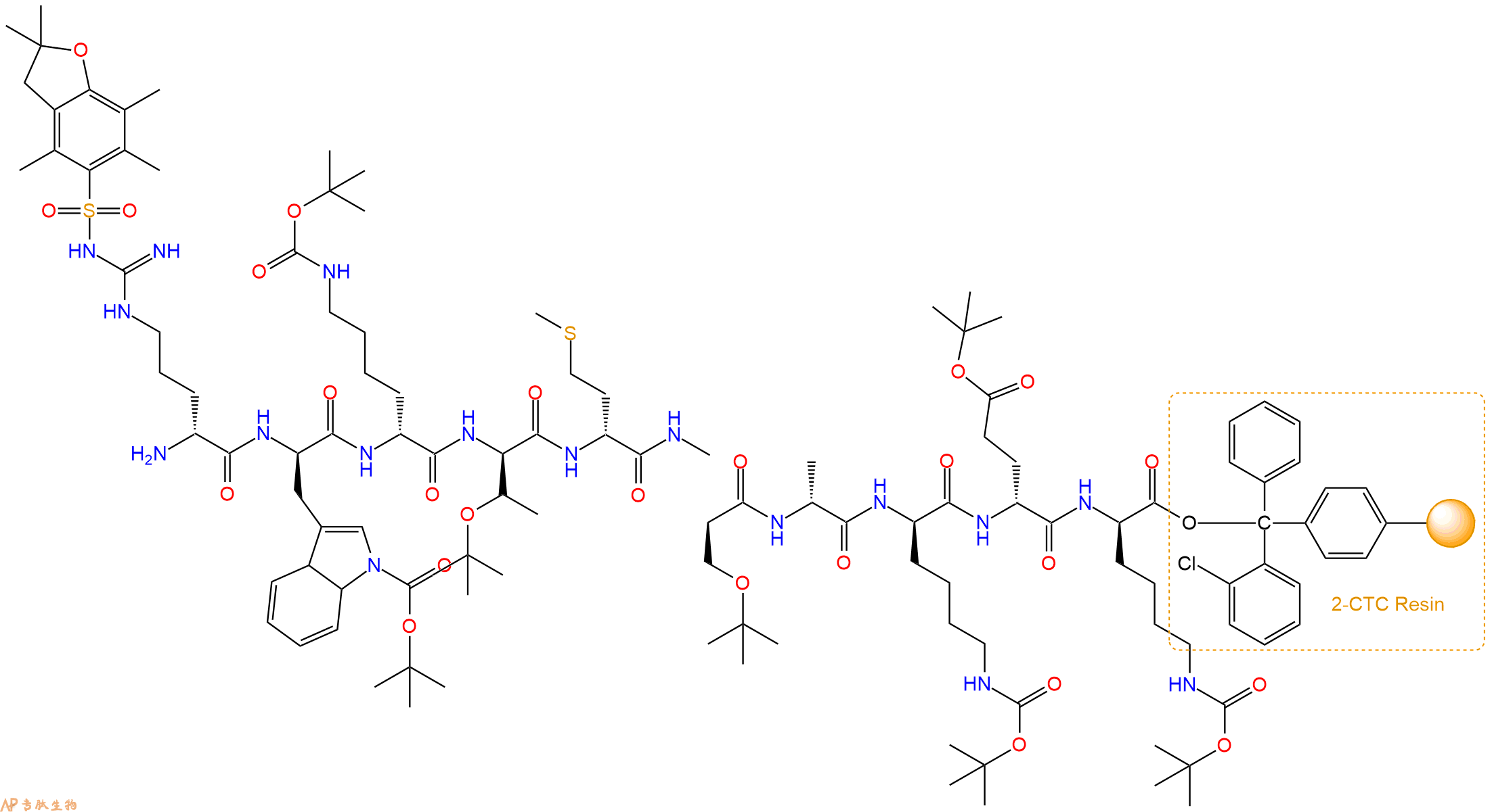 最后再经过步骤二得到 H2N-DArg(Pbf)-DTrp(Boc)-DLys(Boc)-DThr(tBu)-DMet-DSer(tBu)-DAla-DLys(Boc)-DGlu(OtBu)-DLys(Boc)-CTC Resin,结构如下: