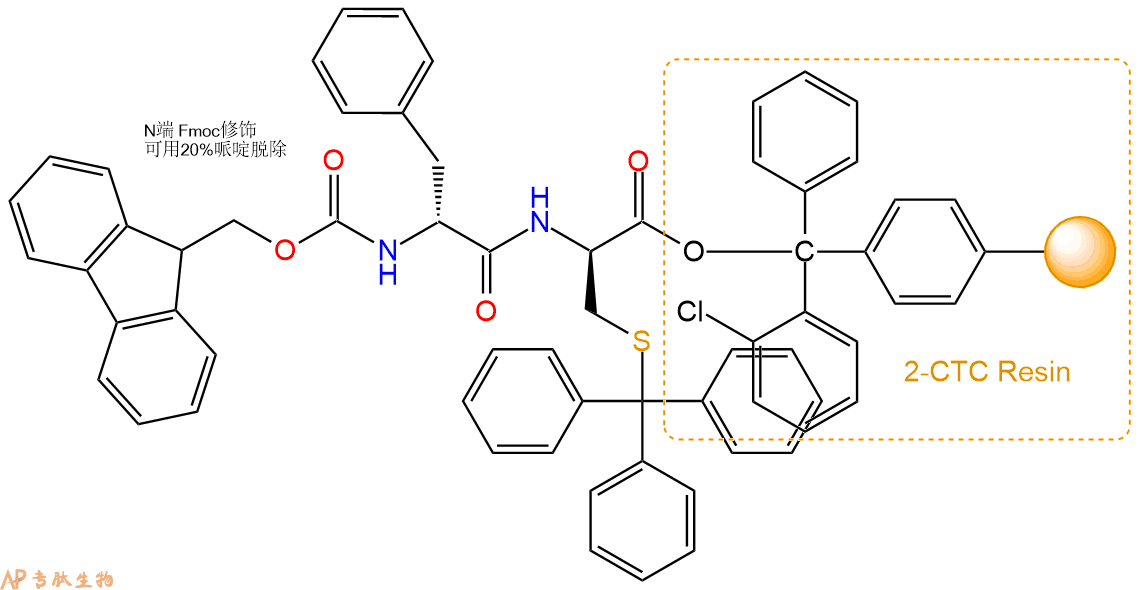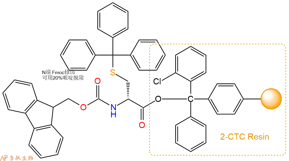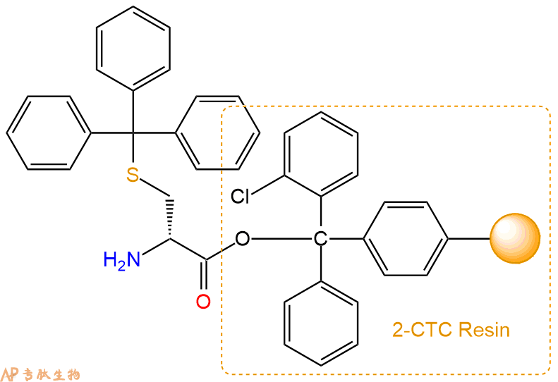1、合成CTC树脂:称取2.98g CTC Resin(如初始取代度约为0.8mmol/g)和2.86mmol Fmoc-DCys(Trt)-OH于反应器中,加入适量DCM溶解氨基酸(需要注意,此时CTC树脂体积会增大好几倍,避免DCM溶液过少),再加入7.15mmol DIPEA(Mw:129.1,d:0.740g/ml),反应2-3小时后,可不抽滤溶液,直接加入1ml的HPLC级甲醇,封端半小时。依次用DMF洗涤2次,甲醇洗涤1次,DCM洗涤一次,甲醇洗涤一次,DCM洗涤一次,DMF洗涤2次(这里使用甲醇和DCM交替洗涤,是为了更好地去除其他溶质,有利于后续反应)。得到 Fmoc-DCys(Trt)-CTC Resin。结构图如下: