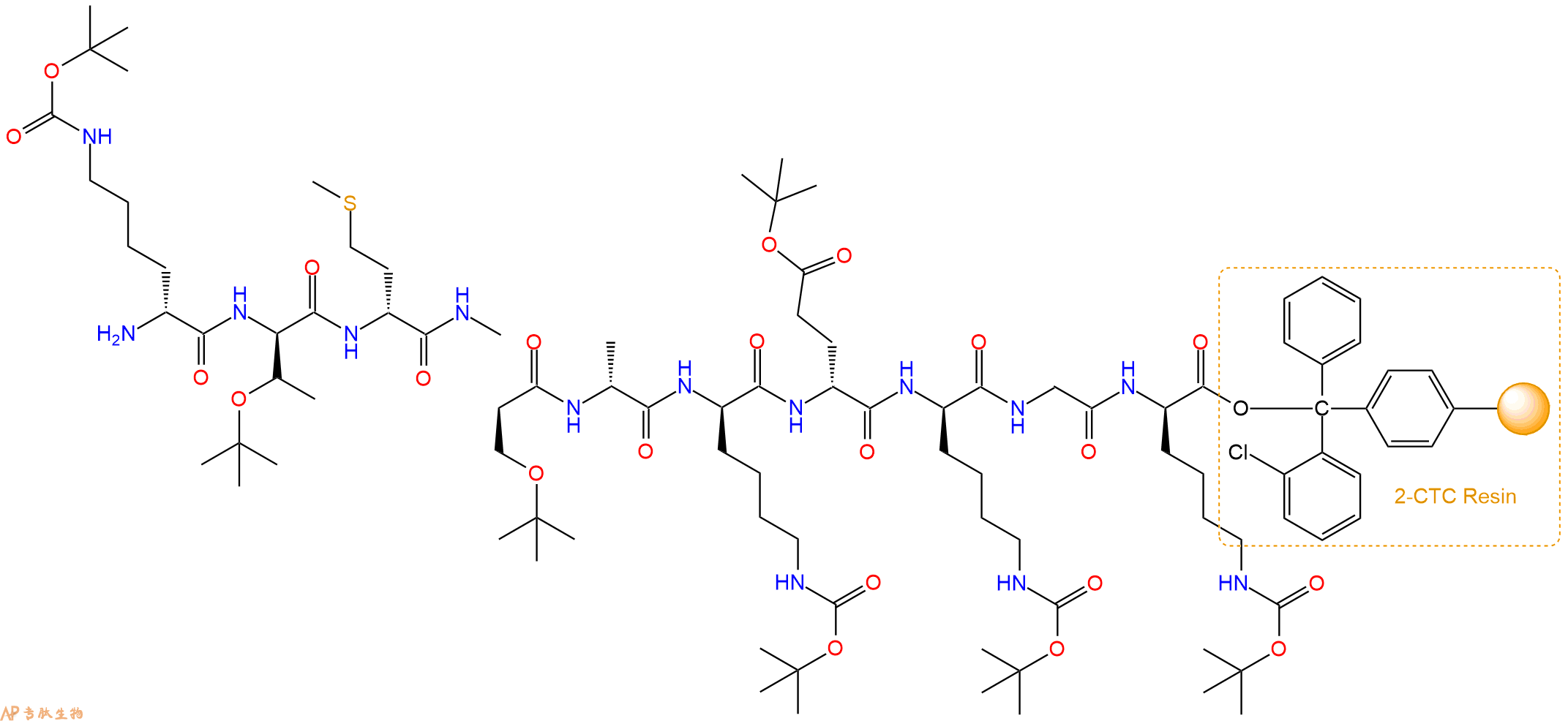 最后再经过步骤二得到 H2N-DLys(Boc)-DThr(tBu)-DMet-DSer(tBu)-DAla-DLys(Boc)-DGlu(OtBu)-DLys(Boc)-Gly-DLys(Boc)-CTC Resin,结构如下: