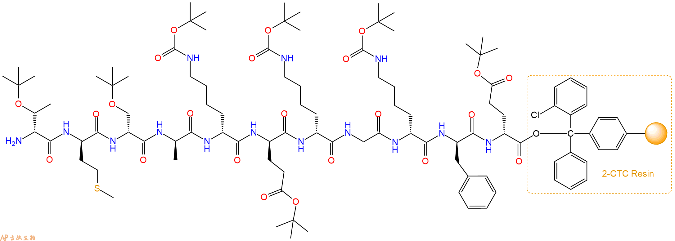 最后再经过步骤二得到 H2N-DThr(tBu)-DMet-DSer(tBu)-DAla-DLys(Boc)-DGlu(OtBu)-DLys(Boc)-Gly-DLys(Boc)-DPhe-DGlu(OtBu)-CTC Resin,结构如下: