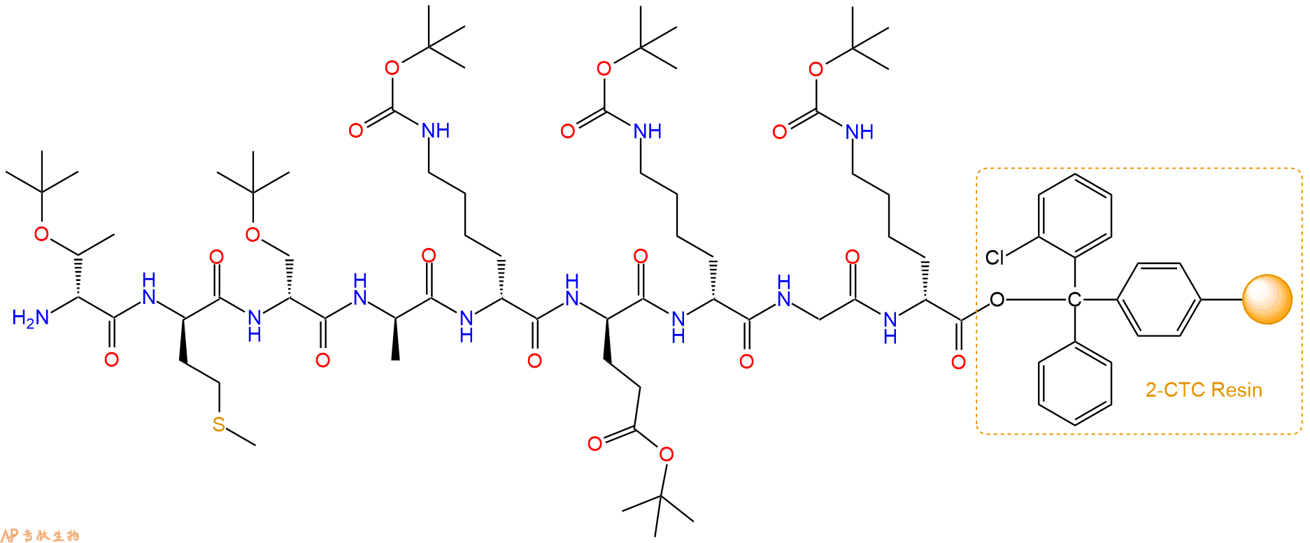 最后再经过步骤二得到 H2N-DThr(tBu)-DMet-DSer(tBu)-DAla-DLys(Boc)-DGlu(OtBu)-DLys(Boc)-Gly-DLys(Boc)-CTC Resin,结构如下: