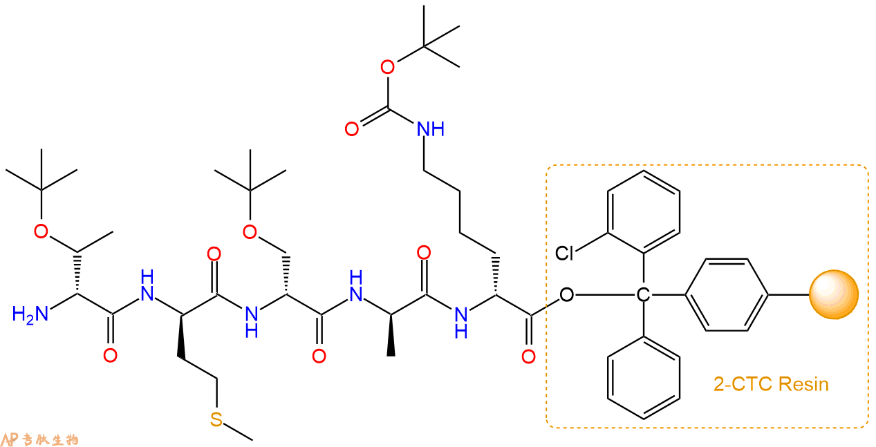最后再经过步骤二得到 H2N-DThr(tBu)-DMet-DSer(tBu)-DAla-DLys(Boc)-CTC Resin,结构如下: