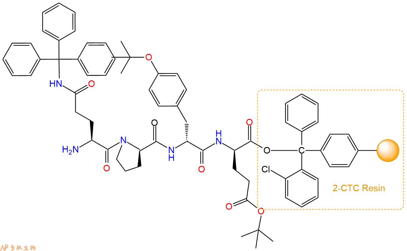 最后再经过步骤二得到 H2N-DGln(Trt)-DPro-DTyr(tBu)-DGlu(OtBu)-CTC Resin,结构如下: