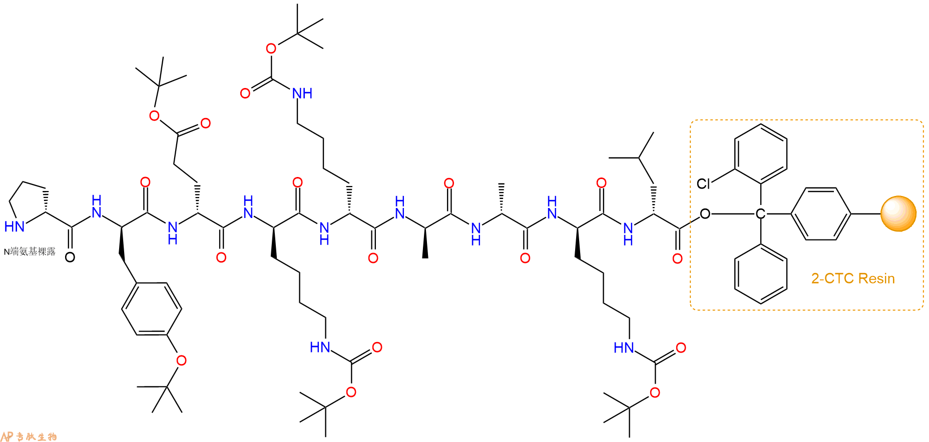 最后再经过步骤二得到 H2N-DPro-DTyr(tBu)-DGlu(OtBu)-DLys(Boc)-DLys(Boc)-DAla-DAla-DLys(Boc)-DLeu-CTC Resin,结构如下:
