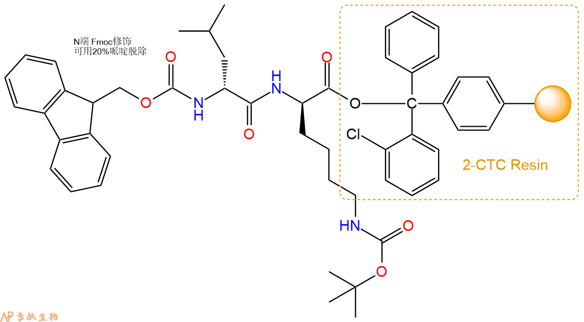 3、缩合:取0.34mmol Fmoc-DLeu-OH 氨基酸,加入到上述树脂里,加适当DMF溶解氨基酸,再依次加入0.68mmol DIPEA,0.32mmol HBTU。反应30分钟后,取小样洗涤,茚三酮检测为无色。用2倍树脂体积的DMF 洗涤3次树脂。(洗涤树脂,去掉残留溶剂,为下一步反应做准备)。得到Fmoc-DLeu-DLys(Boc)-CTC Resin。氨基酸:DIPEA:HBTU:树脂=3:6:2.85:1(摩尔比)。结构图如下: