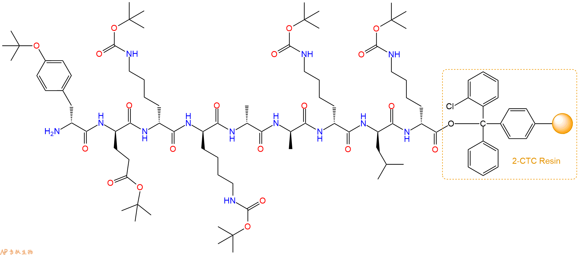 最后再经过步骤二得到 H2N-DTyr(tBu)-DGlu(OtBu)-DLys(Boc)-DLys(Boc)-DAla-DAla-DLys(Boc)-DLeu-DLys(Boc)-CTC Resin,结构如下: