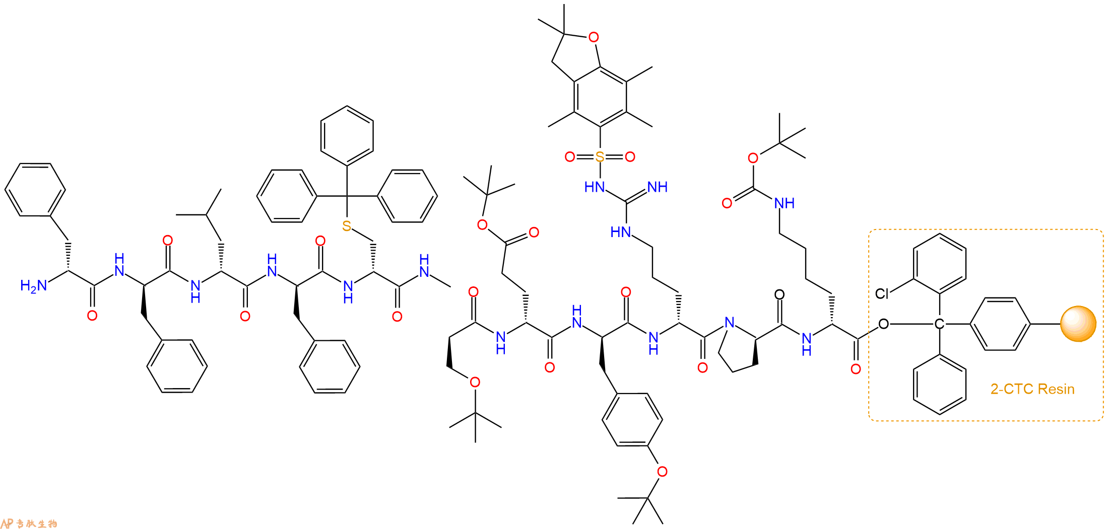 最后再经过步骤二得到 H2N-DPhe-DPhe-DLeu-DPhe-DCys(Trt)-DSer(tBu)-DGlu(OtBu)-DTyr(tBu)-DArg(Pbf)-DPro-DLys(Boc)-CTC Resin,结构如下: