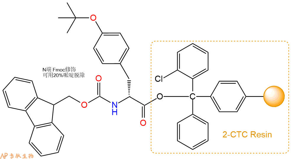 1、合成CTC树脂:称取1.08g CTC Resin(如初始取代度约为0.58mmol/g)和0.75mmol Fmoc-DTyr(tBu)-OH于反应器中,加入适量DCM溶解氨基酸(需要注意,此时CTC树脂体积会增大好几倍,避免DCM溶液过少),再加入1.88mmol DIPEA(Mw:129.1,d:0.740g/ml),反应2-3小时后,可不抽滤溶液,直接加入1ml的HPLC级甲醇,封端半小时。依次用DMF洗涤2次,甲醇洗涤1次,DCM洗涤一次,甲醇洗涤一次,DCM洗涤一次,DMF洗涤2次(这里使用甲醇和DCM交替洗涤,是为了更好地去除其他溶质,有利于后续反应)。得到 Fmoc-DTyr(tBu)-CTC Resin。结构图如下: