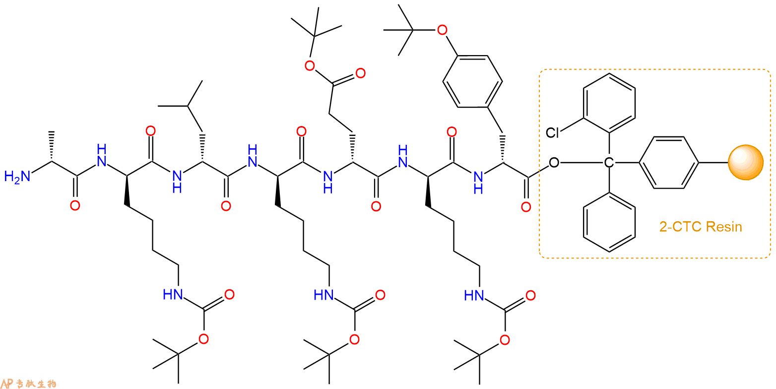 最后再经过步骤二得到 H2N-DAla-DLys(Boc)-DLeu-DLys(Boc)-DGlu(OtBu)-DLys(Boc)-DTyr(tBu)-CTC Resin,结构如下: