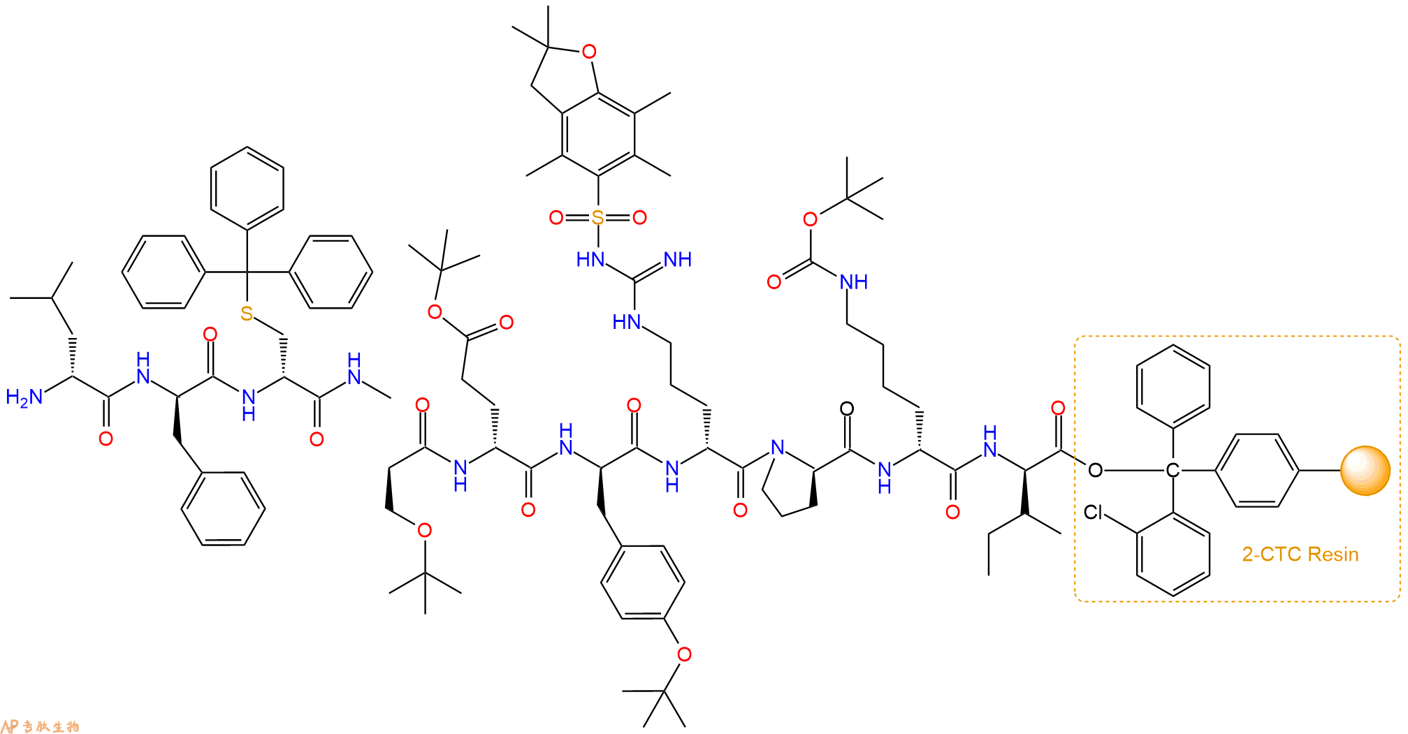 最后再经过步骤二得到 H2N-DLeu-DPhe-DCys(Trt)-DSer(tBu)-DGlu(OtBu)-DTyr(tBu)-DArg(Pbf)-DPro-DLys(Boc)-DIle-CTC Resin,结构如下: