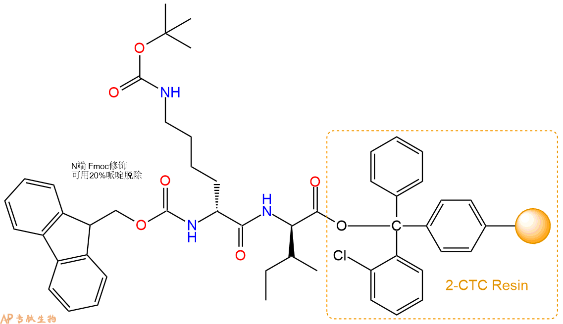 1、合成CTC树脂:称取1.91g CTC Resin(如初始取代度约为0.51mmol/g)和1.17mmol Fmoc-DIle-OH于反应器中,加入适量DCM溶解氨基酸(需要注意,此时CTC树脂体积会增大好几倍,避免DCM溶液过少),再加入2.92mmol DIPEA(Mw:129.1,d:0.740g/ml),反应2-3小时后,可不抽滤溶液,直接加入1ml的HPLC级甲醇,封端半小时。依次用DMF洗涤2次,甲醇洗涤1次,DCM洗涤一次,甲醇洗涤一次,DCM洗涤一次,DMF洗涤2次(这里使用甲醇和DCM交替洗涤,是为了更好地去除其他溶质,有利于后续反应)。得到 Fmoc-DIle-CTC Resin。结构图如下: