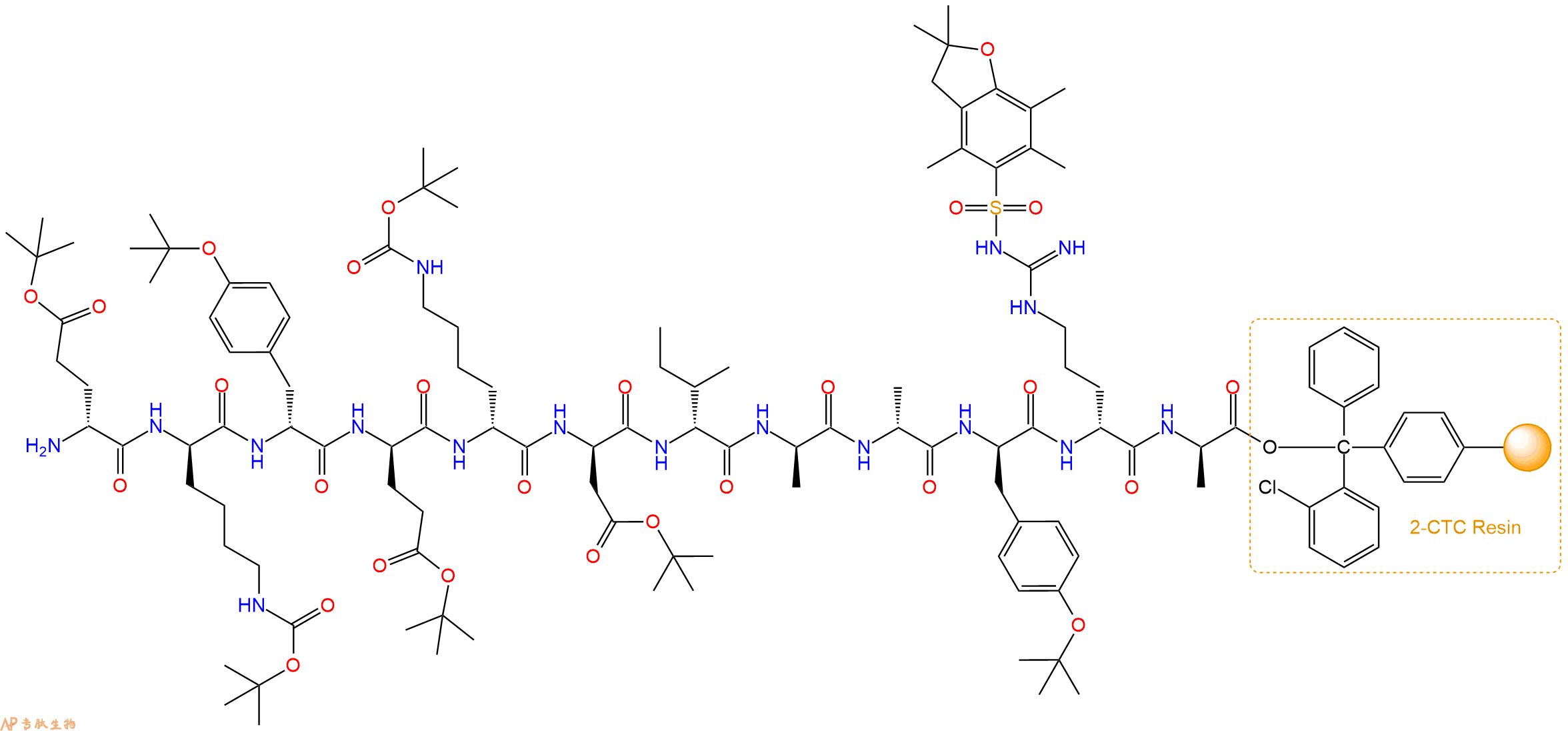 最后再经过步骤二得到 H2N-DGlu(OtBu)-DLys(Boc)-DTyr(tBu)-DGlu(OtBu)-DLys(Boc)-DAsp(OtBu)-DIle-DAla-DAla-DTyr(tBu)-DArg(Pbf)-DAla-CTC Resin,结构如下: