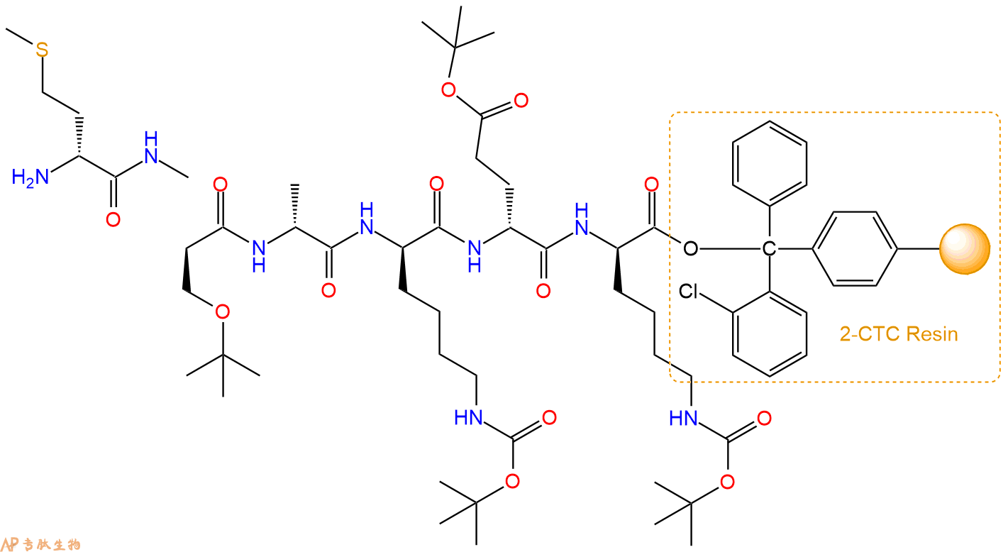 最后再经过步骤二得到 H2N-DMet-DSer(tBu)-DAla-DLys(Boc)-DGlu(OtBu)-DLys(Boc)-CTC Resin,结构如下:
