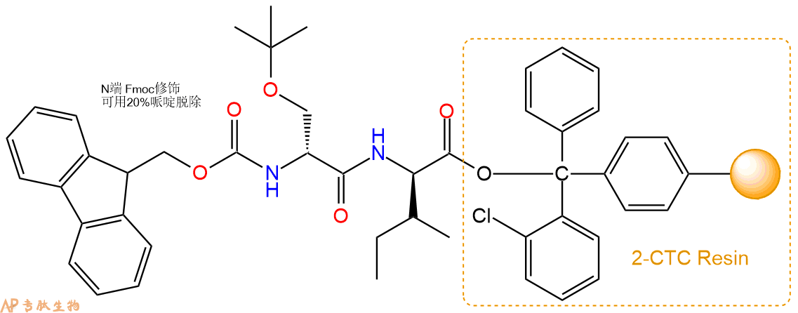 1、合成CTC树脂:称取2.09g CTC Resin(如初始取代度约为0.77mmol/g)和1.93mmol Fmoc-DIle-OH于反应器中,加入适量DCM溶解氨基酸(需要注意,此时CTC树脂体积会增大好几倍,避免DCM溶液过少),再加入4.83mmol DIPEA(Mw:129.1,d:0.740g/ml),反应2-3小时后,可不抽滤溶液,直接加入1ml的HPLC级甲醇,封端半小时。依次用DMF洗涤2次,甲醇洗涤1次,DCM洗涤一次,甲醇洗涤一次,DCM洗涤一次,DMF洗涤2次(这里使用甲醇和DCM交替洗涤,是为了更好地去除其他溶质,有利于后续反应)。得到 Fmoc-DIle-CTC Resin。结构图如下:
