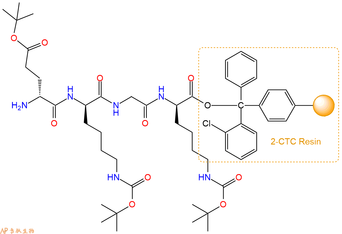 最后再经过步骤二得到 H2N-DGlu(OtBu)-DLys(Boc)-Gly-DLys(Boc)-CTC Resin,结构如下: