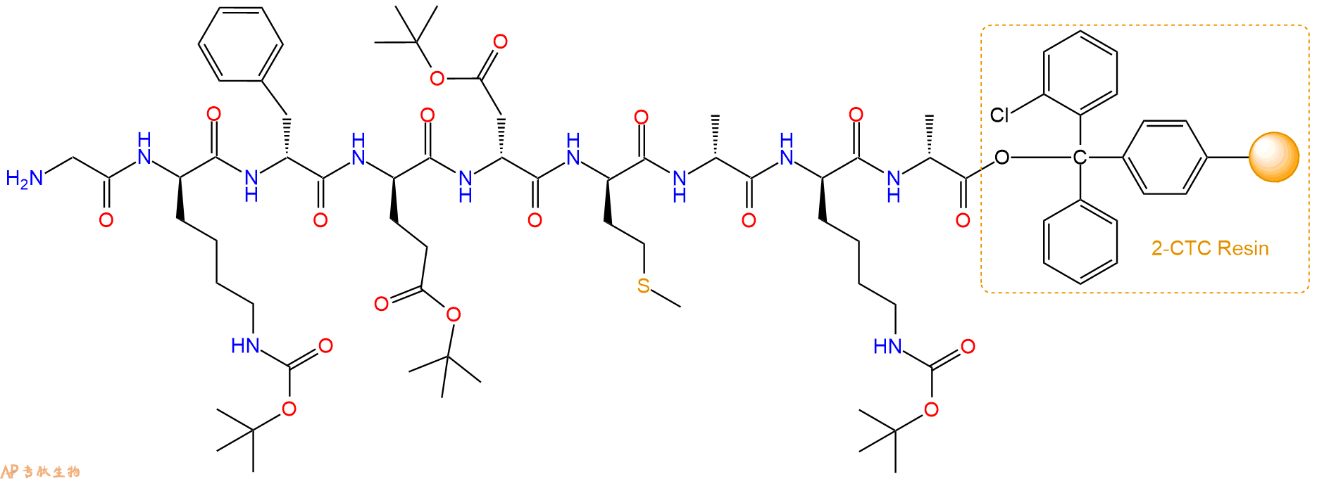 最后再经过步骤二得到 H2N-Gly-DLys(Boc)-DPhe-DGlu(OtBu)-DAsp(OtBu)-DMet-DAla-DLys(Boc)-DAla-CTC Resin,结构如下:
