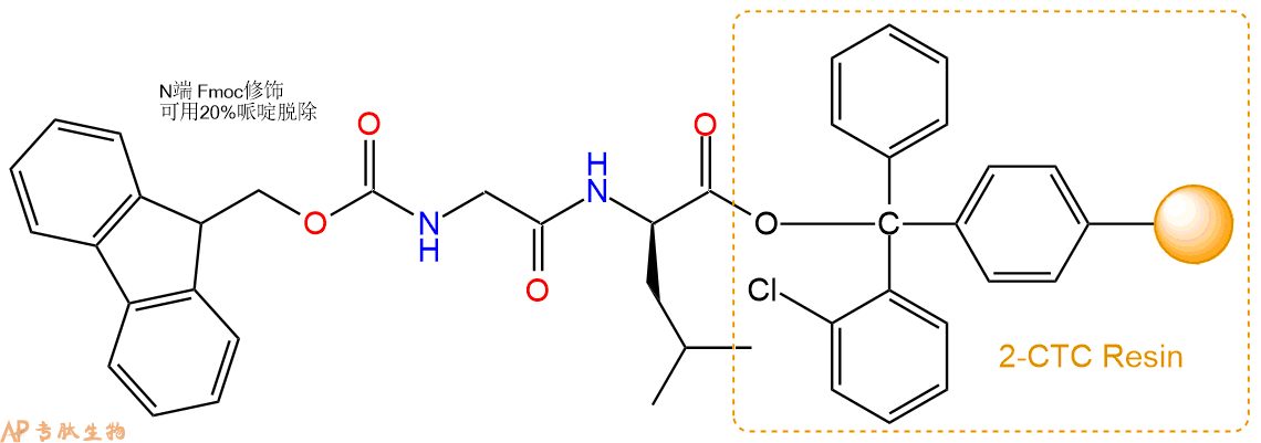 1、合成CTC树脂:称取2.21g CTC Resin(如初始取代度约为1.03mmol/g)和2.73mmol Fmoc-DLeu-OH于反应器中,加入适量DCM溶解氨基酸(需要注意,此时CTC树脂体积会增大好几倍,避免DCM溶液过少),再加入6.83mmol DIPEA(Mw:129.1,d:0.740g/ml),反应2-3小时后,可不抽滤溶液,直接加入1ml的HPLC级甲醇,封端半小时。依次用DMF洗涤2次,甲醇洗涤1次,DCM洗涤一次,甲醇洗涤一次,DCM洗涤一次,DMF洗涤2次(这里使用甲醇和DCM交替洗涤,是为了更好地去除其他溶质,有利于后续反应)。得到 Fmoc-DLeu-CTC Resin。结构图如下: