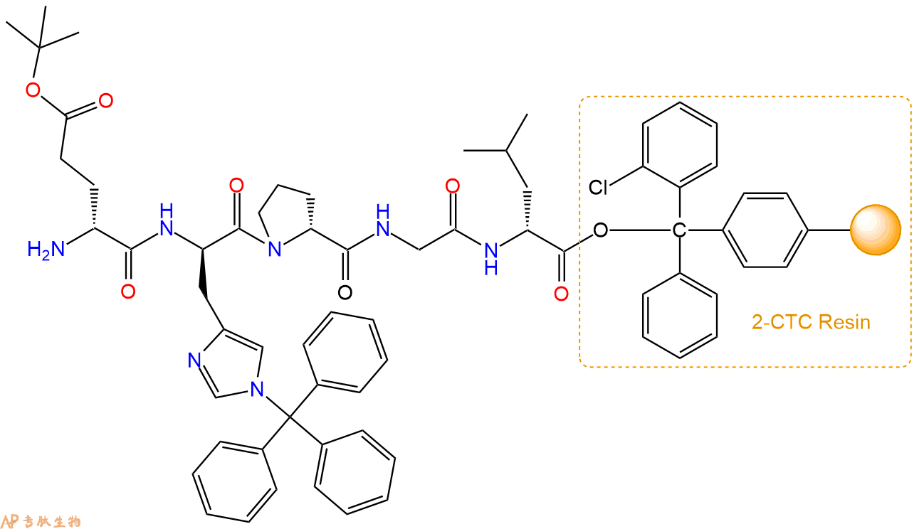 最后再经过步骤二得到 H2N-DGlu(OtBu)-DHis(Trt)-DPro-Gly-DLeu-CTC Resin,结构如下: