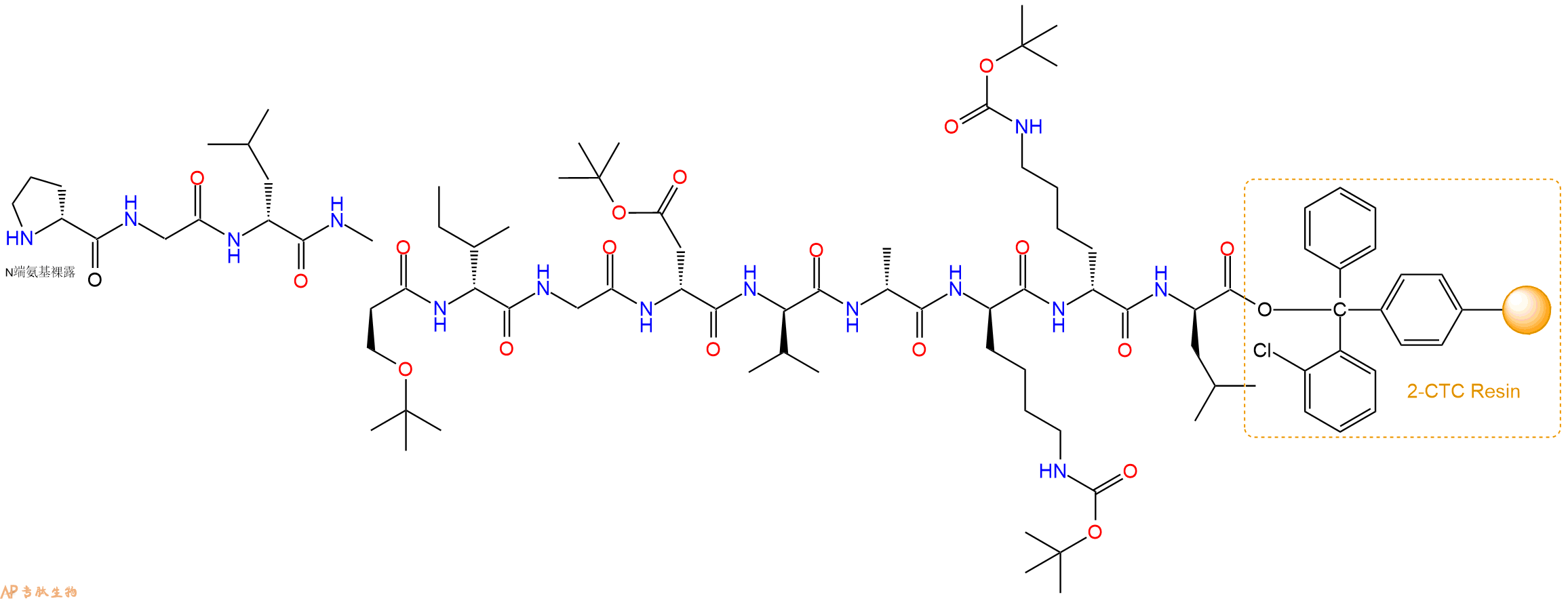 最后再经过步骤二得到 H2N-DPro-Gly-DLeu-DSer(tBu)-DIle-Gly-DAsp(OtBu)-DVal-DAla-DLys(Boc)-DLys(Boc)-DLeu-CTC Resin,结构如下: