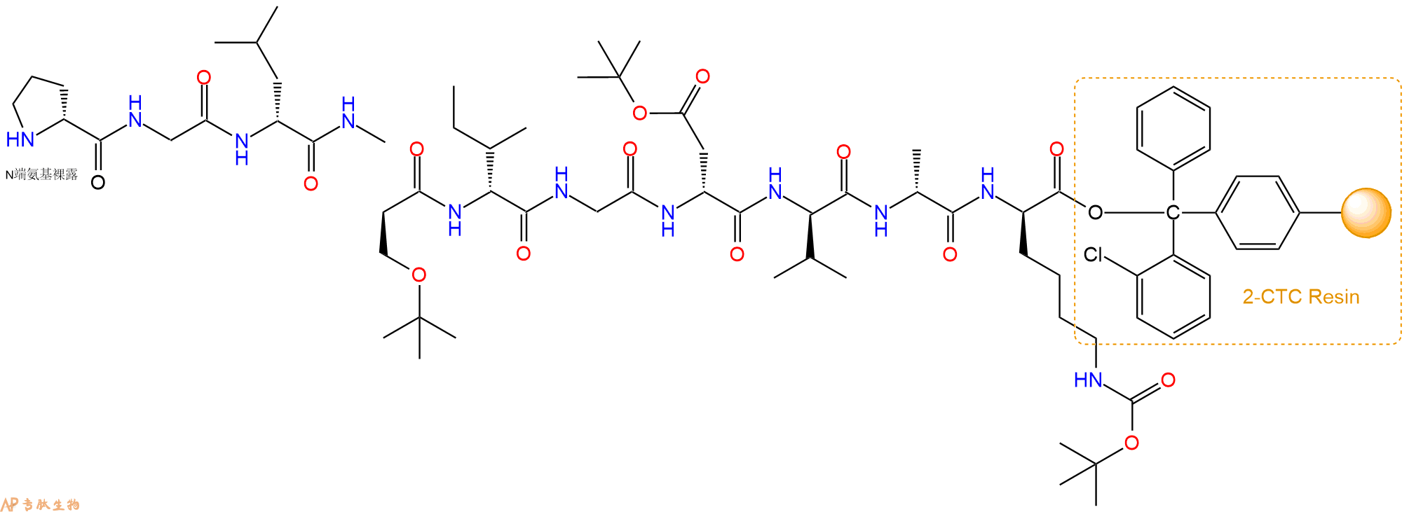 最后再经过步骤二得到 H2N-DPro-Gly-DLeu-DSer(tBu)-DIle-Gly-DAsp(OtBu)-DVal-DAla-DLys(Boc)-CTC Resin,结构如下: