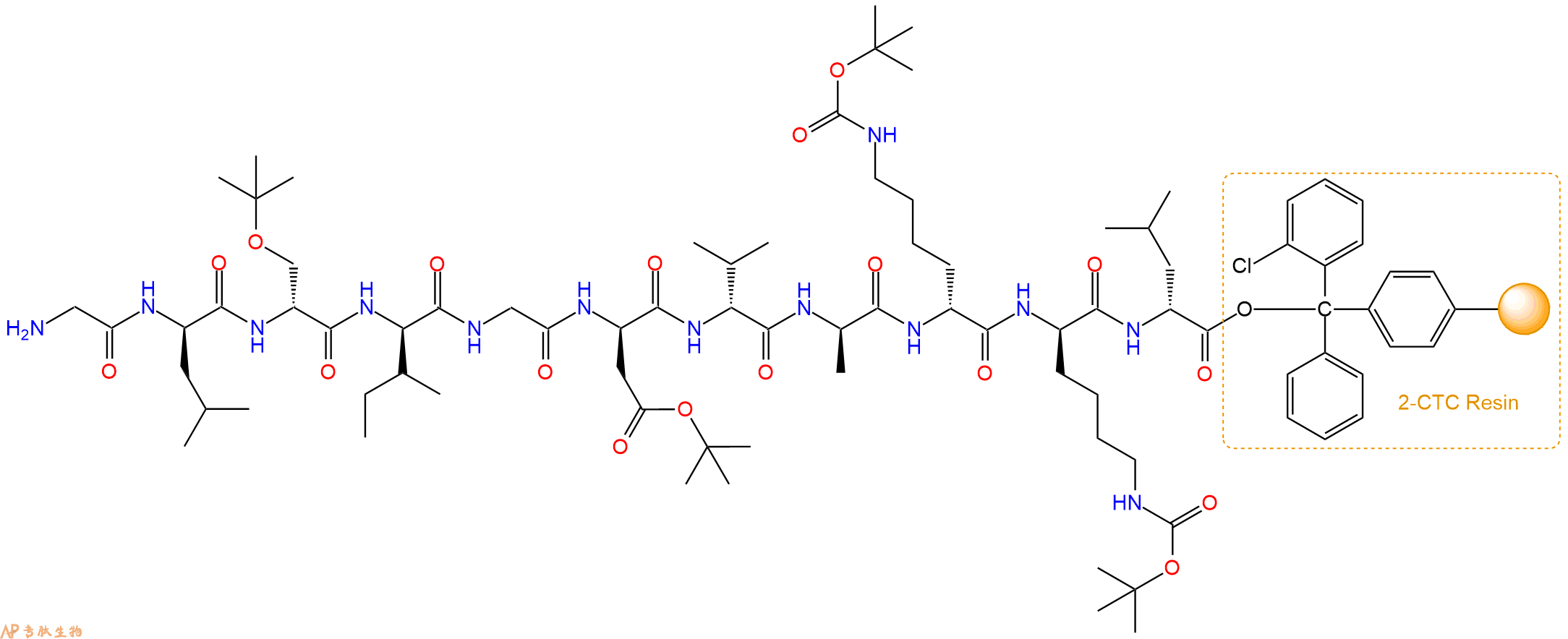 最后再经过步骤二得到 H2N-Gly-DLeu-DSer(tBu)-DIle-Gly-DAsp(OtBu)-DVal-DAla-DLys(Boc)-DLys(Boc)-DLeu-CTC Resin,结构如下: