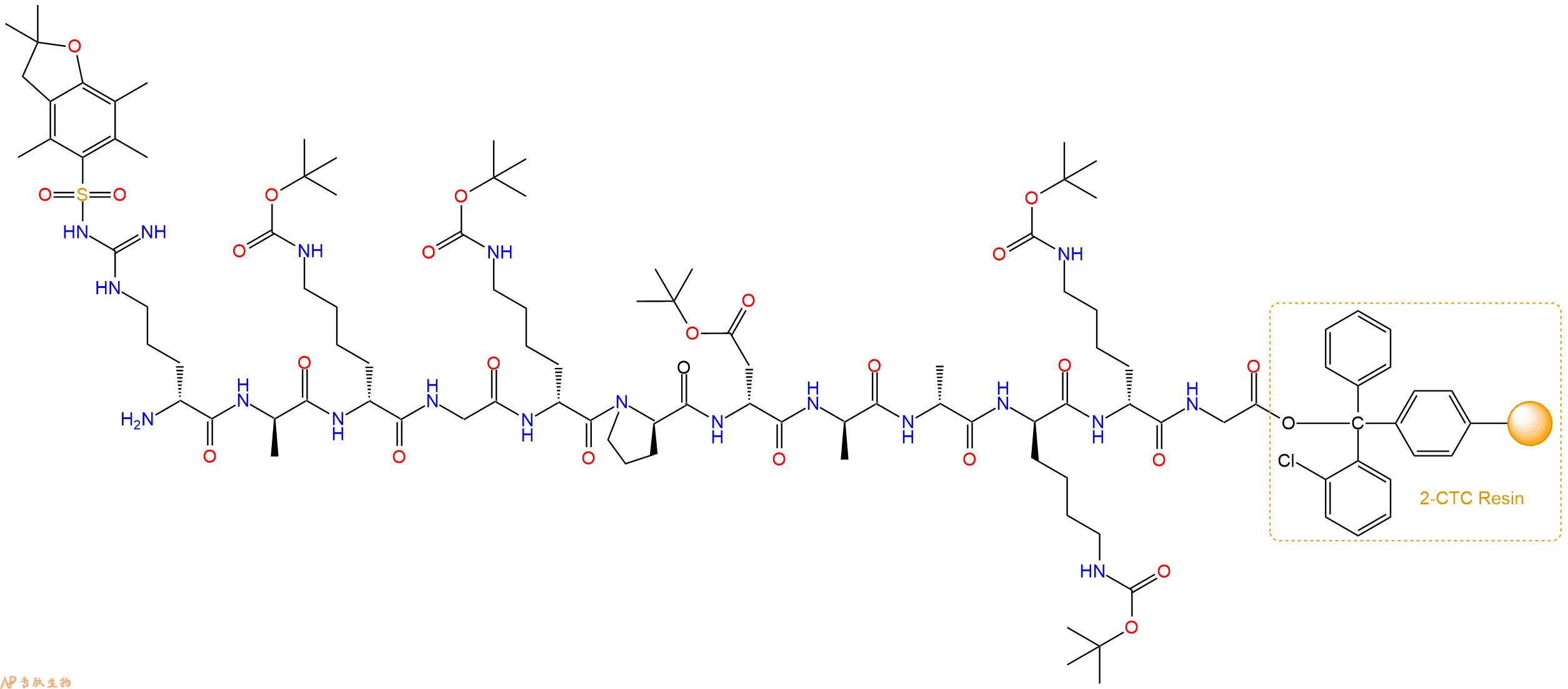 最后再经过步骤二得到 H2N-DArg(Pbf)-DAla-DLys(Boc)-Gly-DLys(Boc)-DPro-DAsp(OtBu)-DAla-DAla-DLys(Boc)-DLys(Boc)-Gly-CTC Resin,结构如下: