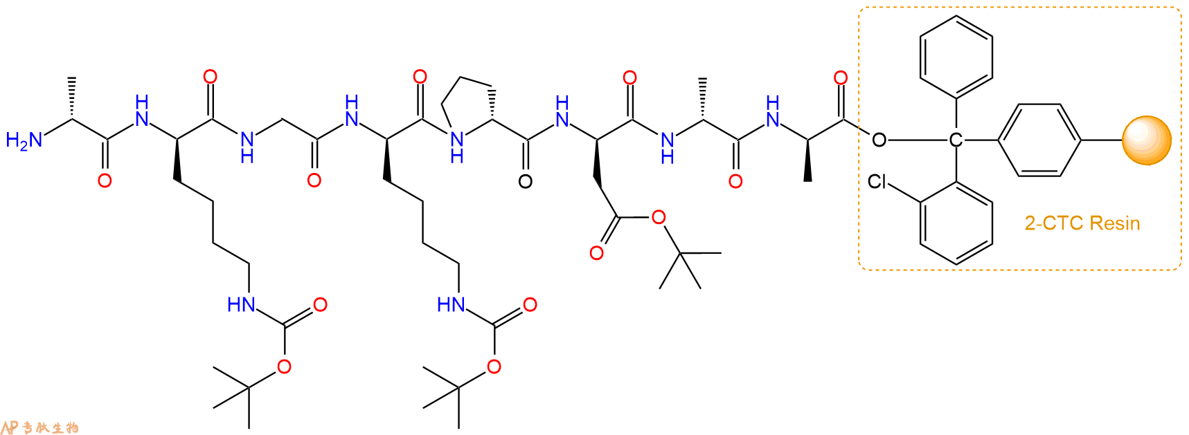最后再经过步骤二得到 H2N-DAla-DLys(Boc)-Gly-DLys(Boc)-DPro-DAsp(OtBu)-DAla-DAla-CTC Resin,结构如下: