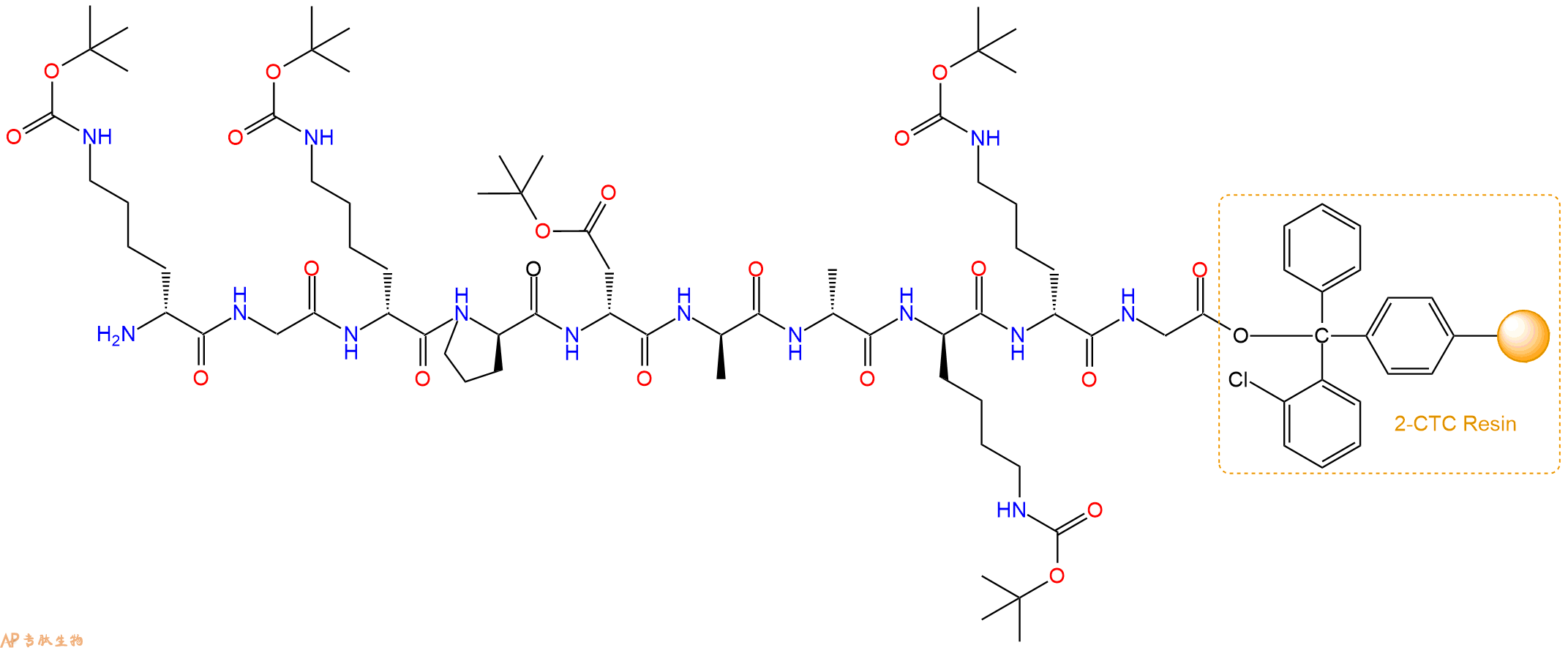 最后再经过步骤二得到 H2N-DLys(Boc)-Gly-DLys(Boc)-DPro-DAsp(OtBu)-DAla-DAla-DLys(Boc)-DLys(Boc)-Gly-CTC Resin,结构如下: