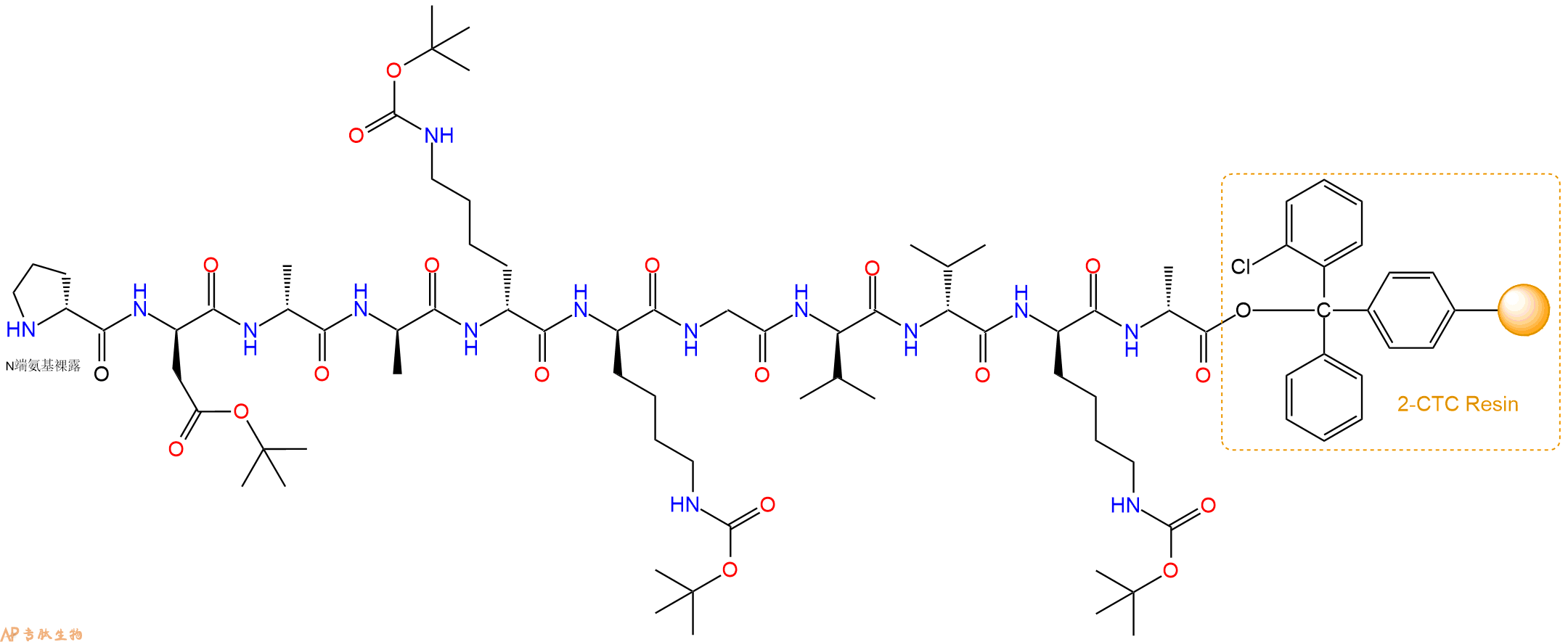 最后再经过步骤二得到 H2N-DPro-DAsp(OtBu)-DAla-DAla-DLys(Boc)-DLys(Boc)-Gly-DVal-DVal-DLys(Boc)-DAla-CTC Resin,结构如下: