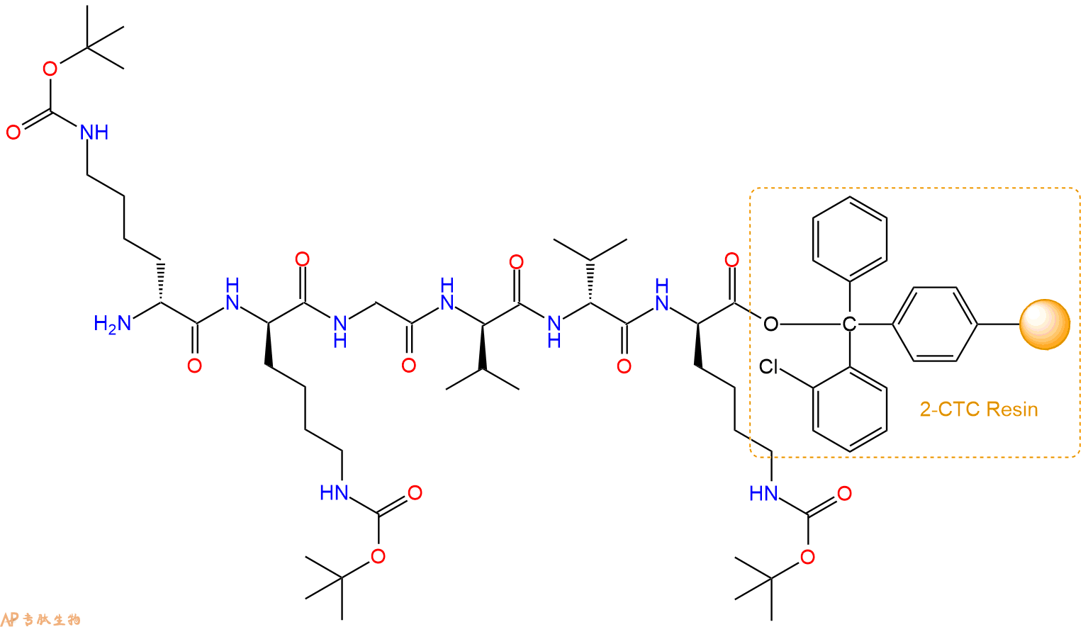 最后再经过步骤二得到 H2N-DLys(Boc)-DLys(Boc)-Gly-DVal-DVal-DLys(Boc)-CTC Resin,结构如下: