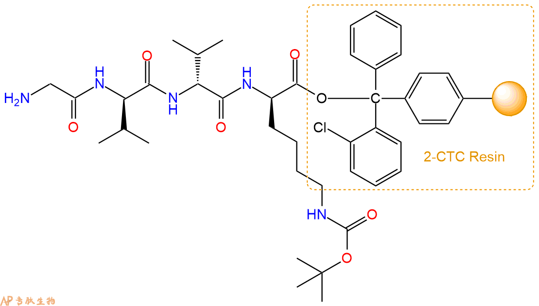 最后再经过步骤二得到 H2N-Gly-DVal-DVal-DLys(Boc)-CTC Resin,结构如下: