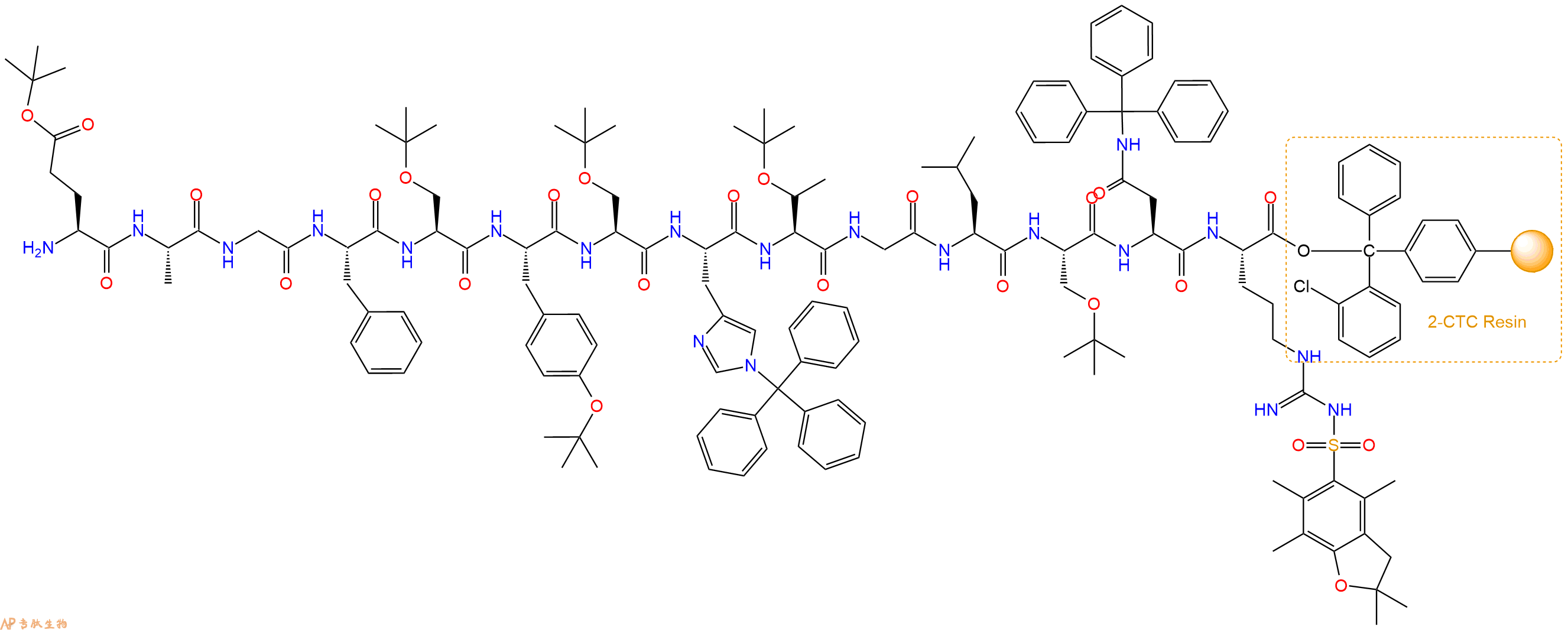 最后再经过步骤二得到 H2N-Glu(OtBu)-Ala-Gly-Phe-Ser(tBu)-Tyr(tBu)-Ser(tBu)-His(Trt)-Thr(tBu)-Gly-Leu-Ser(tBu)-Asn(Trt)-Arg(Pbf)-CTC Resin,结构如下: