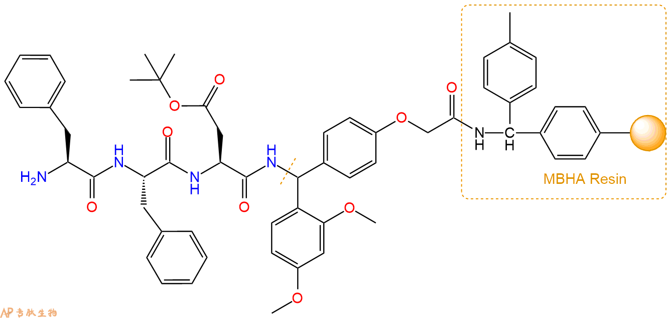 最后再经过步骤二得到 H2N-Phe-Phe-Asp(OtBu)-Linker-MBHA Resin,结构如下: