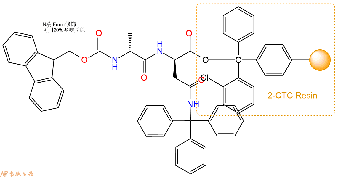 1、合成CTC树脂:称取2.65g CTC Resin(如初始取代度约为0.97mmol/g)和3.08mmol Fmoc-DAsn(Trt)-OH于反应器中,加入适量DCM溶解氨基酸(需要注意,此时CTC树脂体积会增大好几倍,避免DCM溶液过少),再加入7.71mmol DIPEA(Mw:129.1,d:0.740g/ml),反应2-3小时后,可不抽滤溶液,直接加入1ml的HPLC级甲醇,封端半小时。依次用DMF洗涤2次,甲醇洗涤1次,DCM洗涤一次,甲醇洗涤一次,DCM洗涤一次,DMF洗涤2次(这里使用甲醇和DCM交替洗涤,是为了更好地去除其他溶质,有利于后续反应)。得到 Fmoc-DAsn(Trt)-CTC Resin。结构图如下: