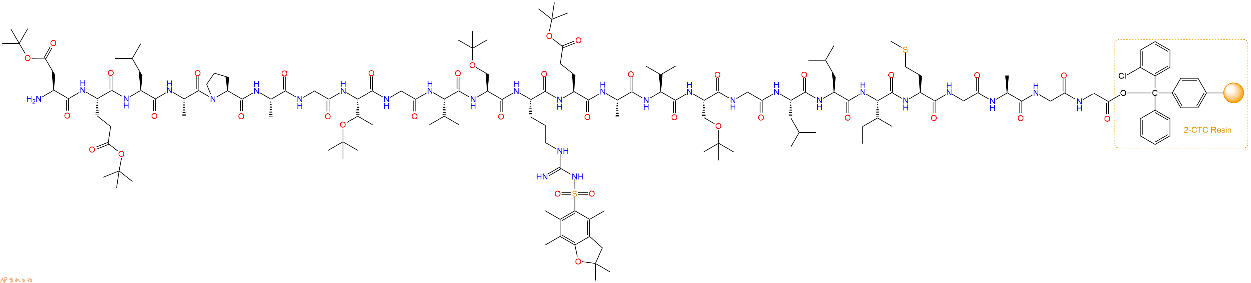 最后再经过步骤二得到 H2N-Asp(OtBu)-Glu(OtBu)-Leu-Ala-Pro-Ala-Gly-Thr(tBu)-Gly-Val-Ser(tBu)-Arg(Pbf)-Glu(OtBu)-Ala-Val-Ser(tBu)-Gly-Leu-Leu-Ile-Met-Gly-Ala-Gly-Gly-CTC Resin,结构如下: