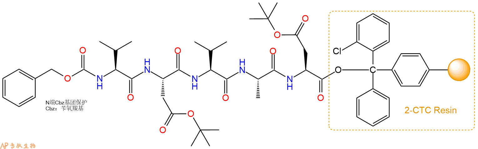 5、苯甲氧羰酰琥珀酰亚胺Cbz-Cl反应连接:在上述树脂中,加入适当DMF后,再加入5.32mmol 苯甲氧羰酰琥珀酰亚胺Cbz-Cl到树脂中,再加入10.64mmol DIPEA、5.06mmol HBTU,鼓氮气反应30分钟。用2倍树脂体积的DMF 洗涤3次树脂(洗涤树脂,去掉残留溶剂,为下一步反应做准备)。 得到Cbz-Val-Asp(OtBu)-Val-Ala-Asp(OtBu)-CTC Resin。 结构如下: