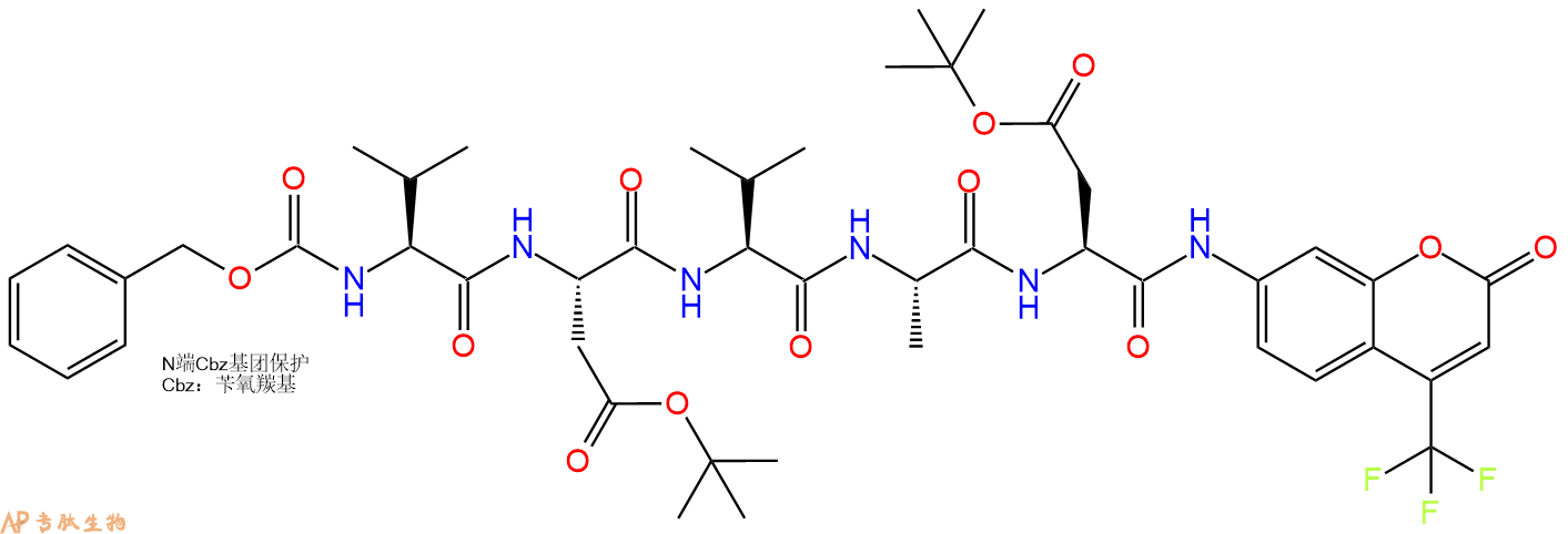 7、7-氨基-4-三氟甲基香豆素反应连接:在上述树脂中,加入适当DMF后,再加入5.32mmol 7-氨基-4-三氟甲基香豆素到树脂中,再加入10.64mmol DIPEA、5.06mmol HBTU,鼓氮气反应30分钟。用2倍树脂体积的DMF 洗涤3次树脂(洗涤树脂,去掉残留溶剂,为下一步反应做准备)。 得到 Cbz-Val-Asp(OtBu)-Val-Ala-Asp(OtBu)-AFC。 结构如下: