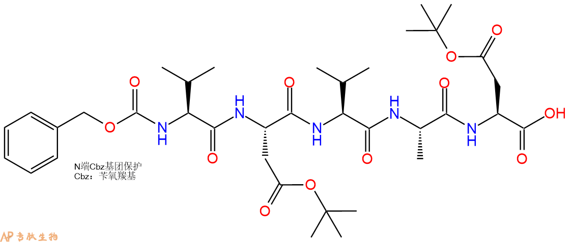 6、全保护切割:配置0.5%TFA/DCM溶液,溶液体积约为树脂体积的3倍。再次用DCM洗涤树脂2遍(去除残留DMF),后将配置好的溶液倒入到反应器中,反应30分钟。抽滤树脂,收集滤液(此时多肽已经从树脂上分离,存在于滤液中)。多肽序列为 Cbz-Val-Asp(OtBu)-Val-Ala-Asp(OtBu)-CTC Resin。 在滤液中添加DIEPA,调PH至7-8。用饱和NaHCO3洗涤滤液,分离出DCM层溶液。可适当旋蒸DCM层溶液,减少有机溶剂。再次加入1或2倍体积的乙酸乙酯,用稀HCl溶液调PH至微酸性,将多肽从DCM层萃取到乙酸乙酯层。用饱和NaCl洗涤2次乙酸乙酯层。用无水硫酸镁吸收乙酸乙酯层的水分。通过减压旋蒸,直接将乙酸乙酯完全旋蒸掉,得到晶体状固体多肽,用于下一步C端反应。或通过减压旋蒸保留适量乙酸乙酯的溶液体积,加入冰乙醚析出 多肽,然后对多肽进行烘干操作即可用于下一步C端反应。Cbz-Val-Asp(OtBu)-Val-Ala-Asp(OtBu)-COOH的结构图如下。