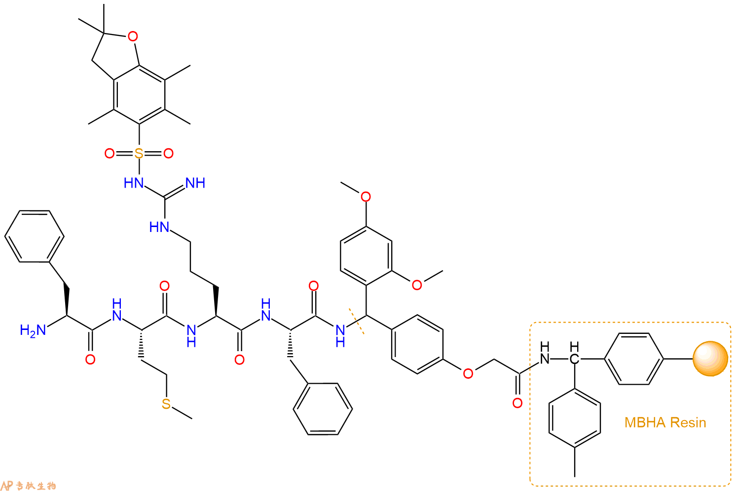 最后再经过步骤二得到 H2N-Phe-Met-Arg(Pbf)-Phe-Linker-MBHA Resin,结构如下: